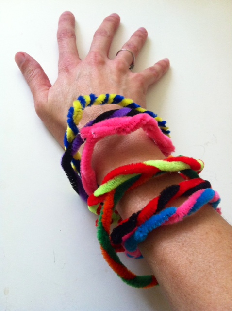 They took turns presenting us with their surprises, explaining the creation of each, anxiously scanning our faces for signs of our pleasure in receiving them. And it’s true, I did receive a lot of fancified felt. But I also got an armful of pipe cleaner bangles (each wrapped separately.)